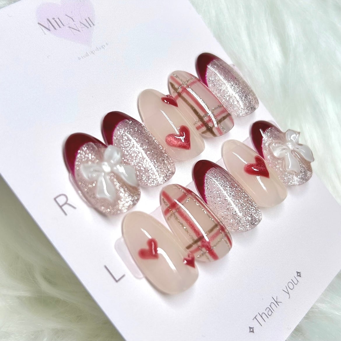 フレンチデザインのベースカラー、ハート、チェックのライン共にマグネットジェルを使用しております